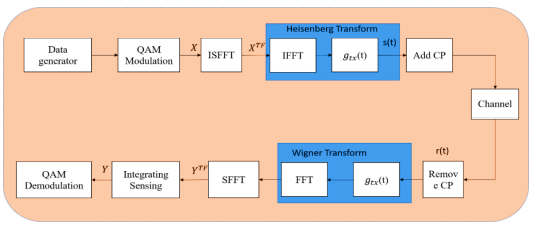 The Heisenberg transform is a form of multicarrier modulation that utilizes the traditional OFDM modulator. Specifically, the Heisenberg transform can be implemented through an inverse fast Fourier transform (IFFT) module and transmit pulse shaping within the framework of conventional OFDM modulation. As explained in [11], [12], [18], [31], the signal 𝑠(𝑡) is transmitted in the time domain using the Heisenberg Transform