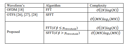 The FFT at point M and inverse FFT at point N have respective complexities of 𝒪((𝑀𝑁)𝑙𝑜𝑔2 (𝑀))and𝒪((𝑀𝑁)𝑙𝑜𝑔2 (𝑁)). Therefore, the total complexity of the proposed MF-F algorithm is of the order of 𝒪((𝑀𝑁 )𝑙𝑜𝑔2(𝑀𝑁 )).The Table 3summarizes the various complexity parameters of various algorithms used in different waveforms.