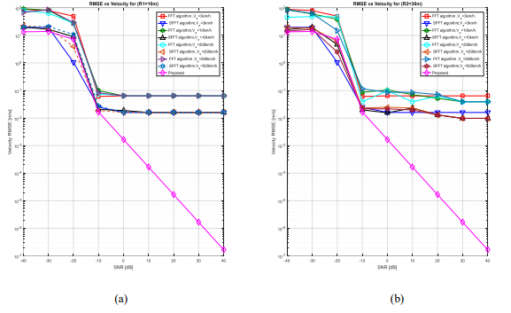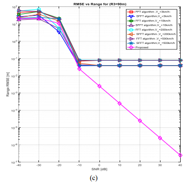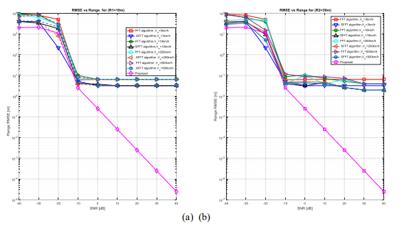 The simulation results presented in Fig.4 showcase the suboptimal Range-sensing performance of the FFT algorithm compared to the other algorithms. Nevertheless, the FFT and SFFT algorithms present a comparable Range sensing performance. In addition, Fig.4 illustrates the range sensing RMSE profile at SNR=10 dB, where the suggested algorithm that combines FFT and SFFT. This exceedsother algorithms dealing with perceptual accuracy, with lower RMSE values. Furthermore, the proposed algorithm demonstrates robustness under varying conditions, with stable perceptual RMSE values, while other algorithms exhibit instability and lack of robustness. In Fig.5, a comparison between our proposed approach and existing techniques, namely FFT, MF-F, and SFFT is presented, in terms of velocity estimation versus SNR radar.