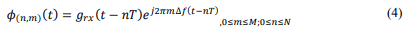 Received signal for time domain, 𝑟(𝑡) is obtained after the transmitted signal, 𝑠(𝑡) passes through a time-frequency selective wireless channel characterized by its impulse response, ℎ(𝑡). The received signal is given by the convolution of the transmitted signal with the channel impulse response, along with the addition of a centered complex Gaussian white noise, 𝑤(𝑡). After the removal of cyclic prefix (CP), the time-frequency samples received, 𝑟(𝑡)is projected onto each orthogonal basis function, 𝜙(𝑛,𝑚) (𝑡) .It can be expressed as an FFT operator applied to continuous time, as stated in [10], [12], [13]:
