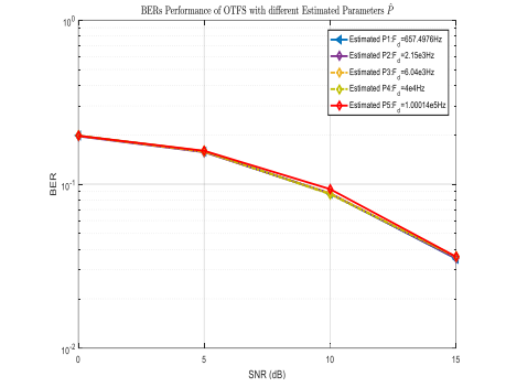In this section, the Bit Error Rate (BER) performance of the proposed OTFS-OFDM method is evaluated for different Doppler frequencies. Initially, an OFDM system is considered as a function of estimated speed, and the corresponding BER is depicted in Fig.6 for different Doppler frequencies. The modulation scheme employed is 64QAM.