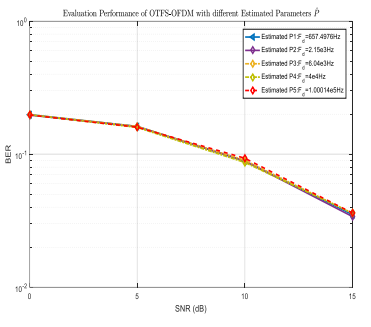 In Fig.6, we have selected five different values for the Doppler Frequency estimate: 𝐹̂ 𝑑=657.4976Hz, 𝐹̂ 𝑑 =2.15 kHz, 𝐹̂ 𝑑 =6.04 kHz, 𝐹̂ 𝑑 =40 kHz, and 𝐹̂ 𝑑 =114 kHz. When the estimated speed is low (3km/h, 10km/h, and 30km/h), the BER values are similar for all cases. However, as the Doppler estimate increases to 𝐹^𝑑 =40 kHz and 𝐹^𝑑 =114 kHz, the BER turns highest among these values. This suggests that higher Doppler frequencies lead to an increase in BER due to inaccurate channel estimation and failure in data detection caused by the allocation of signal power to the channel speed. These findings indicate that as mobility speed increases, OFDM users experience a decline in BER performance. This is because OTFS applies high mobility to achieve DD diversity, while the orthogonality of OFDM subcarriers is compromised in highly mobile scenarios. Fig. 6 demonstrates that the Higher order Modulation scheme requires a big SNR levels to attain a good BER.The BER is assessed from 0 dB to 15 dB for a 64-QAM modulation scheme. It is noticed that OFDM at low Doppler frequency yields the best BER, while OFDM at high mobility results in the lowest BER values within the 0 dB to 15 dB range. Therefore, using low mobility for OFDM processing aligns well with the simulation outcomes in Fig. 6. The findings demonstrate that in scenarios with low mobility, the OFDM approach offers nearly optimal BER that is not affected by the speed utilized. However, as the Doppler frequency increases, the BER encounters a significant rise, leading to suboptimal performance. It is crucial to reconsider the choice of processing tools to address the drawbacks of OFDM in such scenarios. To deal with the problem of high mobility of the waveform, we propose the OTFS waveform as the optimal solution for the proposed waveform. The SNR and the estimation of various parameters assisted by ISAC radar are less affected by the OTFS waveform. Therefore, the higher the noise level, the more important it is to use an ISAC radar for accurate speed estimation.