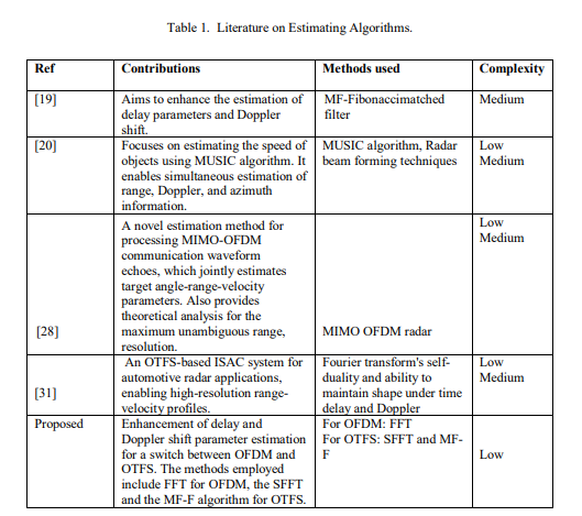Communication Systems (ISAC). To address this challenge, the author of [19] proposes a novel two steps estimation algorithm, the Fibonacci-matched filter (MF-F).This algorithm effectively utilizes waveform characteristics in the Doppler delay shift (DD) domain within orthogonal timefrequency space (OTFS), enhancing the overall performance of the ISAC system. Furthermore, the studies[23], [26] explore potential research areas, including wireless propagation path prediction, electromagnetic spectrum mapping, and Terahertz technology. To address these challenges, the authors propose an Integrated Sensing and Communication (ISAC) estimation system capable of accurately estimating delay, Doppler shifts, velocity, and range of moving objects. Besides, the study in [27] showcases the potential of simultaneously estimating range, Doppler, and azimuth information for any number of objects during transmission, relative to the number of array antenna elements. Among different algorithms used for estimating channel conditions (CE) based on antenna data, MUSIC has been extensively utilized. The implementation of the MUSIC algorithm is straightforward, and it has been modified in various versions to cater to different scenarios while providing high resolution [27]. In addition, the article [28] presents a novel integration strategy for moving vehicle detection and wireless communications utilizing OTFS modulation. By harnessing channel impulse response coefficients, this approach achieves precise detection of mobile targets during wireless transmission, estimating distances and speeds of reflecting targets. Furthermore, incorporating random pilots in OTFS modulation improves vehicle speed estimation in noisy environments, providing a more reliable solution for moving target detection than conventional methods.According to [29], the authors introduce new algorithms that are being developed, enabling the joint estimation of target parameters like angle, range, and velocity using MIMOOFDM waveforms, ultimately enhancing the performance of ISAC systems. Authors in [30] have also, propose a new method for creating a lower complexity automotive radar system using a narrowband OTFS ISAC (Integrated Sensing and Communication) system. By utilizing a single OTFS support as a pilot, this method enables accurate estimation of fractional delay and Doppler shifts, providing higher resolution range velocity profiles. Furthermore, authors in [32] presents an Integrated Sensing and Communication (ISAC) system using Orthogonal Time Frequency Space (OTFS) modulation to obtain accurate range velocity profiles. This system uses an OTFS support with a rectangular pulse as a pilot to simultaneously estimate delay and Doppler shift, enabling the determination of the range and velocity of radar targets.Table 1 below givesa comprehensive summary of the various radar techniques utilized in automotive applications, along with their individual contributions and complexity levels.The Table compares a range of radar techniques, including object velocity estimation, position estimation, and parameter estimation. Furthermore, Table 1 introduces a new technique aimed at improving the estimation of delay and Doppler shift parameters, thereby facilitating a smooth transition between OFDM and OTFS. The methods employed in this technique encompass Fast Fourier Transform (FFT) for OFDM, the Fibonacci matched filter (MF-F) algorithm for OTFS, and Symplectic Fast Fourier Transform (SFFT)