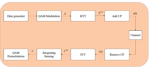 where, 𝑔𝑡𝑥 (𝑡)is the window function. In practice, rectangular transmit and receive pulses that are compatible with OFDM modulation are utilized. Lastly, a cyclic prefix (CP) is added to the time domain signal for each data frame, as suggested in [11], [12], [18], [31], [32].