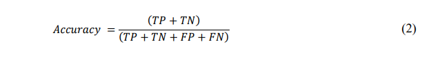 This metric assesses the model’s overall correctness and is calculated as the ratio of correct predictions to total predictions made. It is acceptable when the class distribution is similar. The formula is[36].