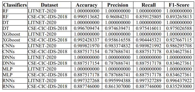 Table 9 shows the performance metrics for multiple ML classifiers used on two different datasets LITNET-2020 and CSE-CIC-IDS-2018. The evaluation criteria include Accuracy, Precision, Recall, and F1-Score, which provide a complete view of each classifier’s efficacy. For the LITNET-2020 dataset, the RF, DT, XGboost, DNNs, and MLP classifiers all received perfect scores (1.000000000), showing flawless prediction ability. The CNNs and RNNs classifiers likewise performed admirably, but somewhat below perfection, with RNNs exhibiting a modest fall in metrics compared to the others. When these classifiers were applied to the CSE-CIC-IDS2018 dataset, most models showed a significant fall in performance metrics, with the exception of the DT and XGboost classifiers, which maintained high scores comparable to those attained on the LITNET-2020 dataset. On the CSE-CIC-IDS-2018 dataset, the CNNs, DNNs, MLP, and RNNs classifiers performed significantly worse than LITNET-2020 in terms of accuracy and F1- Score. This comparative analysis demonstrates the variability in classifier performance across datasets, emphasizing the importance of dataset characteristics and the potential need for model adjustment or selection based on the unique problems given by each dataset. While some classifiers remain stable across both datasets, others may require modifications to improve performance for certain types of network traffic or attack detection scenarios.