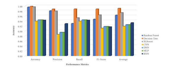 Table 10 illustrates the average performance of several ML classifiers across two cybersecurity datasets. Accuracy, Precision, Recall, F1-Score, and an overall Average score represent the classifiers’ ability to correctly identify security threats. Table 13 shows the average performance of various ML classifiers on two cybersecurity datasets. Accuracy, Precision, Recall, F1-Score, and an overall Average score measure the classifiers’ ability to correctly identify security threats. The RF classifier performs admirably, achieving near-perfect average accuracy and good scores across all criteria. The DT and XGBoost classifiers also produce excellent results, with the DT achieving the greatest average F1-Score and Average metrics, indicating a well-balanced performance in terms of both precision and recall. In comparison, CNNs, DNNs, and MLP classifiers have lower scores, notably in precision, which has an impact on their overall F1-Score and average performance. RNNs outperforms CNNs, DNNs, and MLP in terms of balance and precision, although it still lags behind tree-based classification algorithms. The table shows a wide range of performance, with tree-based classifiers beating neural network-based classifiers on these particular datasets. To better comprehend model performance evaluation metrics, the researcher presented the data in the form of a bar chart, as illustrated in Figure 3.