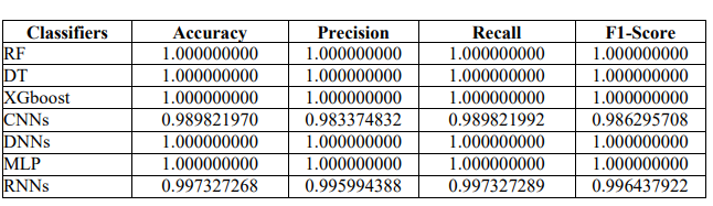 Table 8 compares ML classifiers’ performance on the LITNET-2020 dataset using four essential metrics accuracy, precision, recall, and F1-Score. Most classifiers, including RF, DT, XGBoost, DNNs, and MLP, had perfect scores of 1.000000000 across all criteria, suggesting that they accurately predicted every case. The CNNs and RNNs classifiers performed well, but could not achieve total perfection. The CNNs had an accuracy of 0.989821970, precision of 0.983374832, recall of 0.989821992, and F1-Score of 0.986295708. The RNNs had slightly greater accuracy and recall at 0.997327268 and 0.997327289, respectively, with a precision of 0.995994388 and an F1-Score of 0.996437922. This table shows how well these classifiers can predict and categorize network traffic, with CNNs and RNNs performing somewhat lower but still outstandingly compared to the other models.
