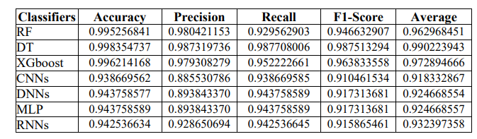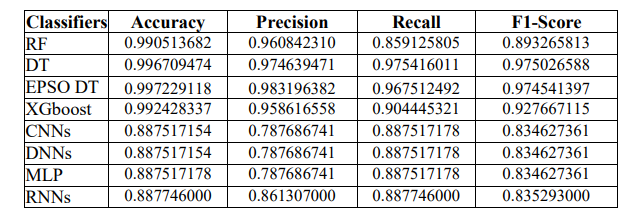 Table 7 compares the performance of different ML classifiers on the CSE-CIC-IDS-2018 dataset using metrics including Accuracy, Precision, Recall, and F1-Score. The RF classifier performs well, with high accuracy (0.990513682), and precision (0.96084231), but somewhat lower recall (0.859125805) and F1-Score (0.893265813), showing a reasonable balance between identifying true positives and minimizing false positives. The DT model beats others in terms of consistency across accuracy (0.974639471) and recall (0.975416011), with a near-perfect F1-Score (0.975026588), indicating that it captures the majority of positive cases without severe overprediction. XGboost also performs well in terms of accuracy (0.992428337) and precisionrecall ratio, resulting in a high F1-Score (0.927667115). CNNs, DNNs, and MLP classifiers, on the other hand, outperform ensemble approaches in terms of accuracy (0.887517154), precision (0.787686741), recall (0.887517178), and F1-Score (0.834627361), with MLP showing slightly adjusted accuracy (0.887517178). This consistency shows that these networks may encounter difficulties because of the dataset’s complexity or class imbalance. The RNNs model improves precision (0.861307000) while maintaining similar accuracy and F1-Score to the CNNs, DNNs, and MLP models, demonstrating a somewhat better but still limited competence in processing sequential data within this unique dataset. Overall, while ensemble models such as RF, DT, and XGboost perform better than neural net-work-based models (CNNs, DNNs, MLP, and RNNs) on the CSE-CIC-IDS-2018 dataset, highlighting the importance of model selection based on dataset characteristics and intended use case for cybersecurity threat detection.