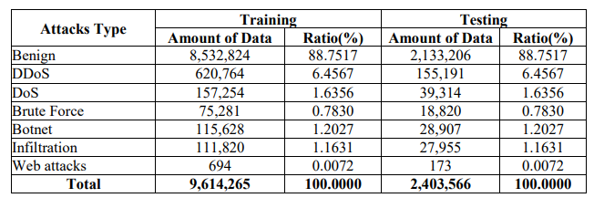 Table 1. CSE-CIC-IDS-2018 Network Traffic Distribution by Labelled Attacks Type and Ratio