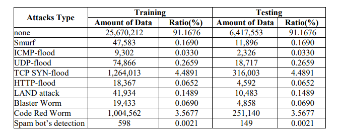 Table 2 categorizes numerous types of network attacks in a dataset of 39,603,674 entries, indicating their amounts and percentages of the total. The vast majority of the data (91.9709%) is classed as ‘none’, suggesting typical, non-attack traffic[21]. Among the attack kinds, the most common is ‘TCP SYN-flood’, which accounts for 3.9896% of the data, followed by ‘Code Red Worm’ attacks at 3.1707%. Other prominent assault types include ‘Smurf’, ‘UDP-flood’, and’ICMP-flood’, among others, each accounting for a minor fraction of the dataset. The variety and proportions of these attacks illustrate the dataset’s composition, demonstrating both benign and malicious traffic, as well as extensive enumeration for analytical and modeling purposes.