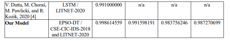 Table 13 compares alternative intrusion detection models using the CSE-CIC-IDS-2018 andLITNET-2020 datasets, with a focus on key parameters including accuracy, precision, recall, and F1- Score. Our model, which uses an EPSO DT, stands out for its superior performance across both datasets. It has an excellent accuracy of around 99.86%, precision of 99.16%, recall of 98.38%, and F1-Score of 98.73%. This shows a high level of accuracy in identifying both actual and potential intrusions while avoiding false positives and negatives. The comparison highlights the efficacy of our EPSO DT model in improving the reliability and security of NIDS, establishing it as a highly competitive strategy in the field of cybersecurity.