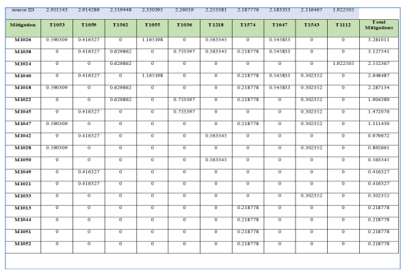 Where, is the number of mitigation controls that belong to attack technique Tjas given in Table 3. Thus, =4, , … , =1.