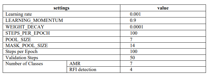 Mask R-CNN with the backbone Resnet101 and Resnet50 architecture was utilized in this work to detect and segment interference as well as recognize signal modulation used by receivers. To realize the algorithm network, this experiment used the Mask R-CNN implementation as provided by Matterport [37]. Python was specifically used for the work experiments through Anaconda, a distribution that combines TensorFlow 2.2 [38] and Keras version 2.3.1 [39] with Python 3.7. Moreover, the transfer learning technique was used to fine-tune the weights of the pre-trained model. This approach leverages pre-existing knowledge from models trained on large datasets to improve performance on our specific task. The dataset was randomly divided into two groups for training and validation: 80% for training and 20% for validation. This partitioning process was used to guarantee that there is enough data for model learning while also retaining a separate set for evaluating the model’s performance on unseen samples. The training set was used to maximize the parameters of the model, while the validation set was used to fine -tune themodel and avoid overfitting. The following Table 2 provides an overview of the training parameters:
