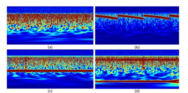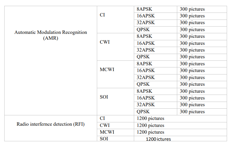 This dataset [30] comprises the scalogram of RFI signals for RFI classification and Modulation recognition applications. SoI is a video stream that is sent using DVB-S2 standards in real-time satellite-to-ground communication. CWI is formed by combining Continuous Wave Interference (CWI) and SOI. MCWI is an abbreviation for Multi-CWI and SoI combined, whereas CI is an abbreviation for SoI mixed with Chirp Interference. Furthermore, SoI has been transmitted utilizing QPSK, 8APSK, 16APSK, and 32APSK modulation patterns, among others. Signal-tonoise ratio (SNR) conditions for the dataset ranged from 5 to 12 dB. Examples of the various scalogram images are displayed in Figure 3. Table 1 displays all dataset characteristics.
