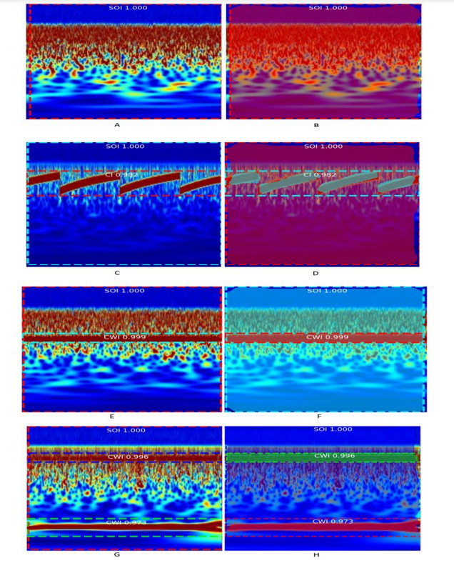Figure 7. A and B illustrate the results of object detection and instance segmentation, respectively. They were accurately generated from the same input using Mask R-CNN. Both outputs clearly show the presence of ‘SOI’ without any interference. The output pictures C and D, which were generated from the same input using Mask R-CNN, demonstrate the outcomes of object detection and instance segmentation, respectively. They show the existence of ‘CWI’ interference in the SOI. The output pictures E and F, which were generated from the same input using Mask R-CNN, demonstrate the outcomes of object detection and instance segmentation, respectively. They show the existence of multiple continuous wave interference (MCWI) in SOI. The output pictures G and H, which were generated from the same input using Mask RCNN, demonstrate the outcomes of object detection and instance segmentation, respectively. They show the existence of ‘CWI’ interference in the SOI.