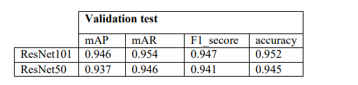 The models precisely detect the objects and give high-quality bounding boxes for the three classes on the test dataset, with a high mAP score of 0.946 for ResNset101 and 0.937 for ResNet50. The high mAP score demonstrates that the models can accurately determine whether objects are there and where they are. Besides, Mask R-CNN architecture with a ResNet101 backbone has a mAR value of 0.954, while ResNet50 has a value of 0.946, indicating good effectiveness in object recall under different scenarios. These mAR scores demonstrate the model’s ability to recall and correctly identify “CWI”, “MCWI” and “CI” objects within the signal of interest. Moreover, the F1scores of 0.947 and 0.941 for Resnet101 and Resnet50, respectively, are balanced statistics that account for both recall and precision. Because they have a high harmonic mean between recall and precision, they are an effective overall measure of the model’s performance. With these values of the F1score, the models appear to have a decent balance between identifying true positives and reducing false positives and false negatives.Moreover, both models demonstrate high accuracy, with ResNet101 achieving 0.952 and ResNet50 reaching 0.945, highlighting their overall correctness in predictions. However, as shown in the table, ResNet101 outperforms ResNet50 due to superior results, which can be attributed to a variety of factors, including its deeper architecture and enhanced ability to capture complex information.