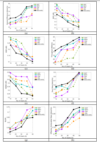 Figure 7. . Performance investigation of implemented channel estimation framework based on user count over conventional techniques in terms of “ (a) Spectral efficiency, (b) BER, (c) MSE, (d) Throughput, (e) NMSE, (f) Sum rate, (g) BLER, and (h) Effective achievable rate”