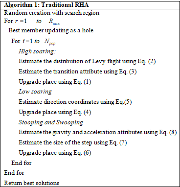 The acceleration of the hawk is given as ‘β’ enhanced with the improvement of ‘s’ to increase the speed of convergence. The variable ‘F’ is the gravity impact that minimizes to decreases the exploitation diversity. Algorithm 1 shows the pseudo-code of conventional RHA.