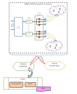 A hybrid deep learning framework is suggested in this work for channel estimation in MIMO-NOMA for the mm Wave system. Initially, the estimation of the channel is performed by employing the AHDL technique. The suggested AHDL mechanism is the combination of the autoencoder and RNN techniques. In this, the AHDL model’s parameters are optimally tuned by the IRHA technique. Further, the complexity and the hardware expenses are minimized by performing beamforming. In the end, the efficacy of the presented model is correlated with some other traditional methods to display its superiority over others.