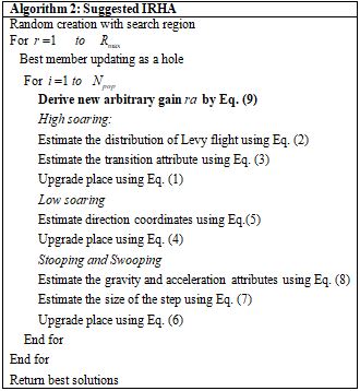 In this, the current fitness is taken as cfc, and the mean fitness is represented as mfm. Then, the worst fitness is considered as WFW. By the derived new arbitrary gain, Eq. (5) in the low soaring phase is modified and optimal solutions. The pseudo-code of recommended IRHA is given in Algorithm 2 and the flowchart of the presented IRHA is shown in Figure 2.