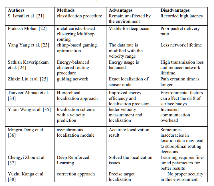 [40] Gupta S, Singh NP, (2024) “Underwater wireless sensor networks: a review of routing protocols, taxonomy, and future directions”, The Journal of Supercomputing, Vol. 80, No. 4, pp 5163-96.