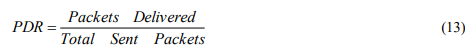 The percentage of the information packets that are delivered successfully to the destination to the overall amount of data packets sent by the source is known as the packet delivery ratio, or PDR. Most often, a percentage is used to express it. The eqn. (13) below is used to calculate it.