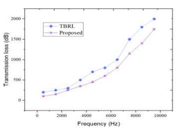The comparison of transmission loss with the existing protocol TBRL is shown in Figure 11. Compared to the TBRL method, the proposed EBbHR achieved a very low transmission loss rate at each varying frequency. The proposed EBbHR attains the transmission loss of 100 dB, 150 dB, 250 dB, 350 dB, 450 dB, 600 dB, 800 dB, 1150 dB, 1400 dB, and 1750dB for the different frequencies such as 500 Hz, 1500 Hz, 2500 Hz, 3500 Hz, 4500 Hz, 5500 Hz, 6500 Hz, 7500 Hz, 8500 Hz, and 9500 Hz.