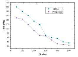 The time required by a routing protocol to create a path connecting the source and destination nodes is known as the path creation time. Figure 12 illustrates how long the recommended optimized protocol takes for different numbers of started nodes to obtain a short path. The path creation time comparison is shown in Figure 13. The proposed EBbHR attained the path in 122.68ms for 50 nodes, 117.61ms for 100 nodes, 97.60ms for 150 nodes, 76.79ms for 200 nodes, 60.37ms for 250 nodes, 58.34ms for 300 nodes, 44.86ms for 350 nodes, 31.41ms for 400 nodes, 30.33ms for 450 nodes, and 27.89ms for 500 nodes. However, the path creation time of the EBbHR is less than that of the existing method TBRL.