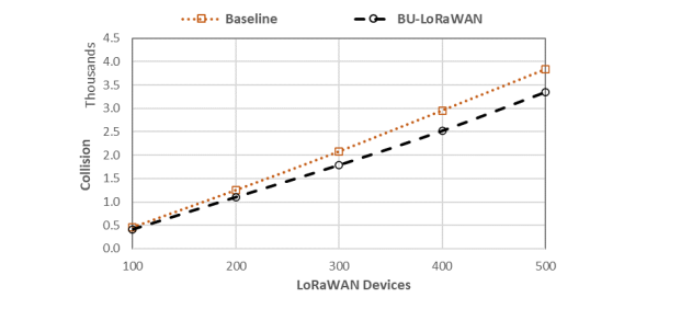 Fig.8 shows the number of collisions for 400 network size as a function of different operation periods. Similar collision incidents are observed by the standards LoRaWAN across different simulation times. This is an indication of traffic being transmitted while gateways are out of sight since no increments in collisions are recorded nor an increase in extraction rate is observed. Furthermore, this is justified by the deterioration of the delivery ratio, as shown in previous figures. Contrariwise, the proposed system keeps delivering traffic to the orbiting gateways; hence, chances of collision increment do exist. This is shown in Fig.8, where the proposed BULoRaWAN collisions increase for network operating for 7200 s. Additionally, the achieved delivery ratio, Fig.5, indicates that more traffic is arriving at gateways in the proposed one, causing more collisions. However, the obtained better performance comes at the expense of higher collisions.