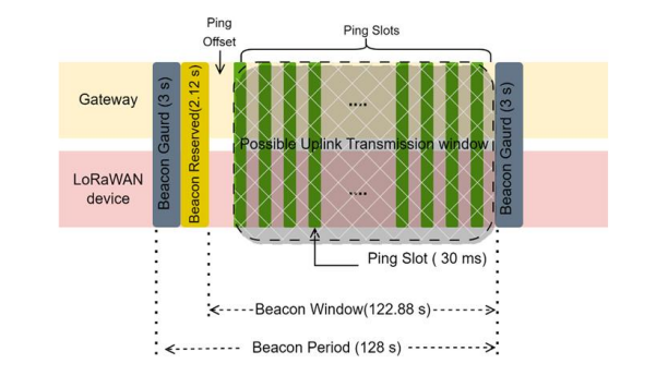 In LoRaWAN class B mode, LoRaWAN devices and gateways are synchronized based on beacon signals to have the end device available for communication at a predictable time. Hence, Network servers will be aware of when to send the downlink traffic to end devices. To achieve such synchronization, gateways broadcast beacons frequently to synchronize possible end devices within the network. The interval between two beacons is known as the beacon period, which is usually 128 seconds. Fig.2 displays the beacon timing for class B mode LoRaWAN. Each beacon period is divided into several slots. 2.12 s, 3 s, and 122.8 s are allocated for the beacon reserved, the beacon guard, and the beacon window, respectively. The beacon window is further divided into small slots of 30 ms, known as ping slots, in which an end device opens its reception window. The beacon guard is used to precede a beacon reserved interval to avoid possible collision between any ping slot traffic and a beacon signal.