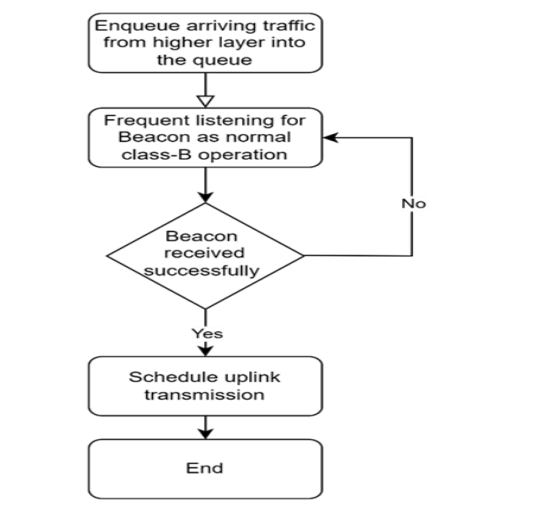The developed scheme utilizes a queue data structure to enqueue any arriving packets at the MAC layer to be transmitted toward one of the available gateways in the constellation. The arrived packets from the higher layer are queued in the queue until the transmission signal is triggered. The queue is inspected frequently based on the occurrence of the internal transmission signal. The transmission timer is calculated on two different occasions. It is mainly calculated once an end device has received a beacon signal. The reception of such a beacon is a sign of being under one of the gateway coverages. Hence, it is an opportunity for delivering the uplink packet. The second occasion for calculating the timer is when the current timer has ended. The new timer is computed within the current beacon window interval whether the queue is empty or not. Consequently, the scheme ensures that it frequently monitors the queue for any recently arrived packets or any upcoming traffic. The flow diagram and the pseudocode are shown in