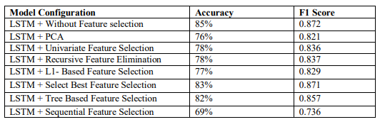The result of the 8 LSTM models with different feature selection methods, PCA feature extraction and with full set of 42 features without any selection on test dataset evaluated by using model evaluation metrics like accuracy and F1 Score. Also used confusion matrix for evaluating the different models. Evaluation score on testing data from UNSW-NB15 dataset repository was slightly lesser than training and evaluation dataset used for training. However, it was ensured that model is not overfit on training data by using the evaluation dataset before applying to testing dataset.