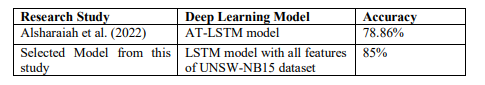 Table 2. Comparison of research out come with a benchmark study on UNSW-NB15 dataset.