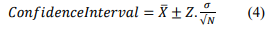 In this equation, πΜ is the sample mean, π is the confidence coefficient, and π is the sample standard deviation. A 95% confidence level is selected, so π = 1.9599.