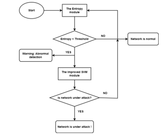 This section introduces our novel methods for detecting DDoS attacks, which combine a dynamic threshold method based on entropy values and an enhanced SVM model inspired by [13]. The flowchart of the model is depicted in Figure 2. In the proposed hybrid model, the entropy module plays a crucial role in identifying potential network anomalies by measuring the variation in information within network traffic. Due to entropy’s high sensitivity to shifts in network traffic,its effectiveness for anomaly detection can be hindered by frequent unexpected drops. These drops often occur when a large number of packets are transmitted to the same target host, potentially leading to false positives for DDoS attacks. To mitigate this risk, the model incorporates a warning condition that prompts further validation to ensure accurate detection