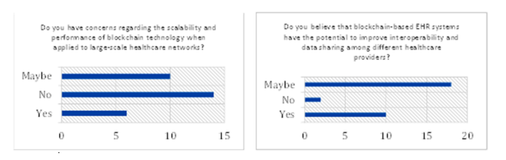 Survey results indicate a strong interest in adopting blockchain technology among participants, with many recognizing its potential to enhance data sharing and privacy. However, concerns were also raised regarding security, cost, and integration within existing healthcare infrastructures. Despite these challenges, the potential benefits of blockchain in healthcare are substantial. The proposed method’s limitations, such as scalability and integration with current systems, suggest that a combined approach utilizing both traditional and blockchain technologies may be a practical first step, allowing for gradual adaptation and testing of blockchain’s advantages.