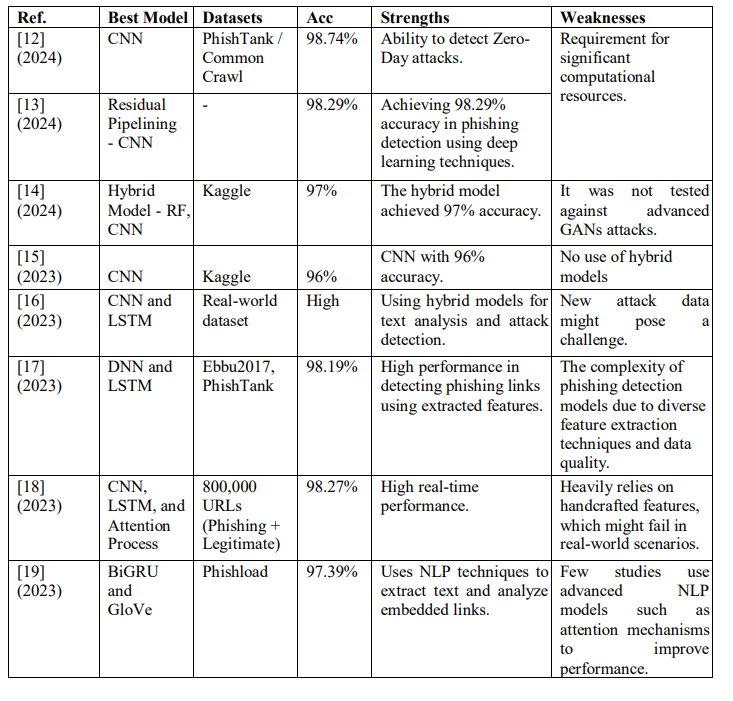 model exhibited exceptional performance, attaining an accuracy of 98.29%, proving its efficacy in identifying phishing attacks. But a constraint was observed concerning the requirement for significant processing resources owing to the difficulty of the deep learning models. Sawant et al. [14], presented a powerful hybrid phishing detection model that combines machine learning and deep learning techniques. They used two Kaggle datasets: one with 11,430 URLs and 87 features, and another with 651,191 URLs and two features. The model combines random forests with CNNs and takes advantage of the strengths of both techniques. The hybrid model achieved 97% accuracy, topping individual models. However, a significant deficiency is the lack of testing against sophisticated threats such as GANs. Nishitha et al. [15], Analyzed phishing URL detection using many machine learning and deep learning methods. The models used were Logistic Regression, KNN, Decision Tree, Random Forest, SVM, and CNN, amongst which were tested for their performances using accuracy and efficiency. A dataset that entails 549,346 URLs from different sources was used; 5,000 instances were chosen for training, which embodied 75% of legitimate URLs and 25% of phishing. Preparing strategies as Regex Tokenizer, Snowball Stemmer, and Count Vectorizer were employed to improve the models’ accuracy. CNN had outstanding results, achieving a 96% accuracy rate, followed by logistic regression at 94.33%. Nevertheless, the study did not look into hybrid models, which potentially improved their efficiency. Kaushik et al. [16], Proposed a deep learning solution for phishing attack detection by deploying the CNN model (LSTM). It works on features extracted from URL and email content for phishing detection. Experiments were conducted with a real dataset (collected) containing phishing emails and legitimate emails by using a hybrid model (CNN-LSTM). Finally, they extracted local patterns from the text and then use CNN to build features for the time series solution with the input as embedding vectors for CNN-LSTM. The only limitation here is new bug and attack data. Ozcan et al. [17], presented a hybrid model of DNNs and LSTMs for link phishing identification. The two primary datasets used were Ebbu2017 (legitimate links, 36,400 and phishing links, 37,175) and PhishTank (26,000 links). This hybrid model can leverage both manually extracted and machine-generated features and that us why they have significant performance improvements. According to the results, him model performs 98.19% better than others in detecting phishing links. The gap here lies in the challenges related to the high complexity of phishing detection models due to the diversity of feature extraction techniques and the different quality of data used. Bozkir et al. [18] introduced a new model to detect phishing websites using n-gram features that can be computed without pre-training or manual feature engineering. Hierarchically stacked network layer model consisting of CNN, LSTM, and attention process They got good and fast at finding patterns in links by selecting n-grams in a smart way. They trained the model on a new dataset of 800,000 URLs (400,000 phishing and 400,000 legitimate). The model is built for highest performance and real-time processing and does not rely on the use of libraries or external services. This model could provide an accuracy of 98.27%, better than other models that worked under adversarial attack. The most prominent gap is the non-diversarity of previous datasets and their dependence on handcrafted features, which were prone to fail when integrated in real-world scenarios. Benavides-Astudillo et al. [19], Presented a model for mining text from web pages to automatically detect phishing attacks by deep learning and natural language processing: The model will use DL and NLP techniques to mine text from web pages and automatically detect phishing attacks. The GloVe model will be incorporated using the Keras Embedding API to obtain the textual features of semantics and syntax. for executing the neural network, such algorithms as LSTM, BiLSTM (2), GRU, and BIGRU were used, with BiGRU giving constant results having an accuracy rate of 97.39%. They have experimented on the Phishload dataset that contains 10,373 samples of phishing pages and legitimate pages. “It actually detects embedded links—but not in the classical sense (URL links)—in those texts. Very few studies analyze text using NLP techniques where other advanced models like attention mechanisms help improve the performance. Table 2 summarizes recent phishing detection studies.