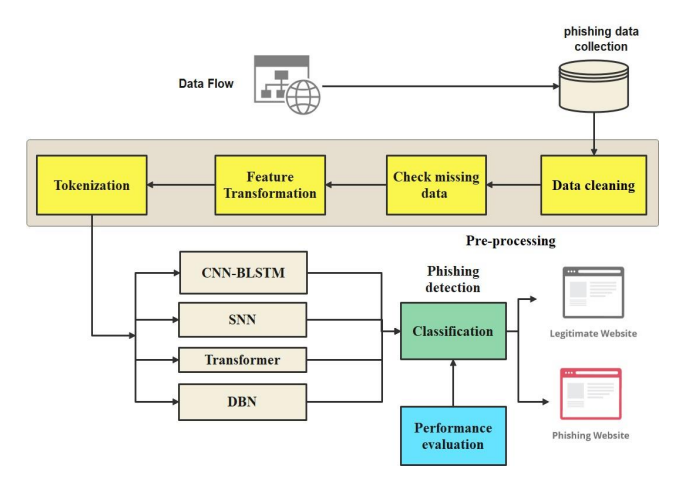 detection, reducing false positives and enabling the early identification of more sophisticated phishing URLs. The phishing detection process involves data collection, pre-processing (such as handling missing data, encoding, and standardization), feature selection, and the subsequent dataset splitting into training, validation, and test sets. Deep learning models, including Transformer, DBN, SNNs, BLSTM, and CNNs, were trained to classify URLs into safe and unsafe categories. Figure 2 illustrates the complete workflow of this process.