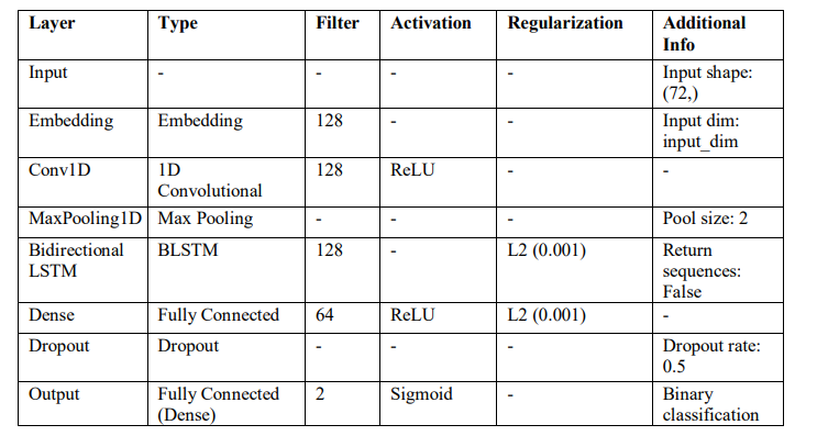 The optimized CNN-BLSTM model marries convolutional and recurrent neural networks for harvesting spatial and temporal patterns in sequence data as shown in Table 4. Starting with an embedding layer that converts input sequences into dense vector representations, it is followed by a 1D convolutional layer with 128 filters and kernel size 5, which pulls out local features from the sequences. It is applied with max pooling so as to reduce dimensionality and retain only important features. The output is then passed to a Bidirectional LSTM layer with 128 units which captures long-term dependencies in both directions (forward and backward) for the model. The BLSTM layer is in turn regularized using L2 regularization to prevent overfitting. Further down the line, to make a complete learning of highly complex patterns, the output of the BLSTM is then fed to a Dense layer having 64 units with ReLU activation. A 0.5 dropout is applied to this layer, applying a technique for reducing overfitting by randomly deactivating a fraction of the units in a layer during the training phase. The output layer is comprised of a dense layer that uses