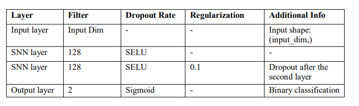 For the last layer, one fully connected dense output layer is taken with a sigmoid activation function in order to perform binary classification, which will give the output as a probability distribution across two classes. The model is compiled with the Adam optimizer and sparse categorical cross-entropy loss for an optimization goal of classification accuracy. Stop conditions are employed throughout the training, in which case it stops if the validation loss does not improve, returning to the best weights. The architecture balances learning capacity and regularization fairly well. It is appropriating for tasks entailing binary classification with self normalizing activations.