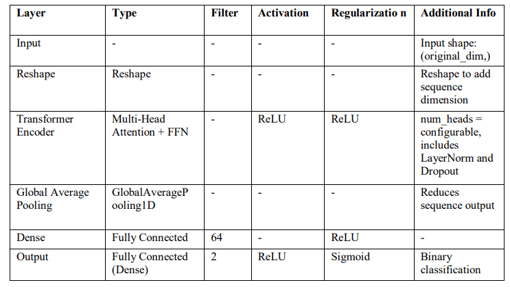 The Transformer Encoder layer implements multi-head self-attention in parallel for ‘num_heads’ attention heads, each having a key dimension of 64, computing attention over the input sequences, followed by two Layer Normalization operations and an FFN. It consists of two dense layers with ReLU activation and a residual connection (to add the input to the output in order to preserve input features and make the learning problem easier from a gradient flow perspective). We apply dropout with a rate of 0.1 after both the attention and feed-forward layers to reduce overfitting. The Transformer encoder reduces the sequence output into a fixedlength vector by applying a global average pooling layer. A fully connected dense layer with 64 units is added to it, using ReLU activation, and then the final dense output layer with softmax activation for multiclass classification. The model is compiled with the Adam optimizer, sparse categorical crossentropy loss, and accuracy (evaluation metric). This architecture merges Transformer’s selfattention with global pooling, and dense layers effectively, hence allowing easy classification for the input data.