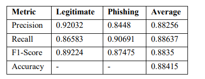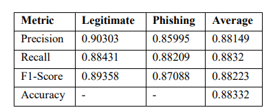 The performance of the Transformer model was evaluated in relation to the key indicators which are presented in table 8. The precision for the legitimate and the phishing classes of the data was recorded as 92.03% and 84.48%, respectively; the average precision was 88.26%. The recall values were higher for the phishing class while the average for legitimate data was 86.58%. The F1-scores for both classes were fairly comparable with average figures of 89.22% and 87.47%.