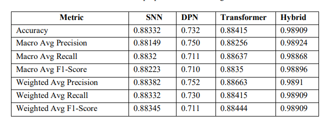 The final performance of the proposed models was Table 12. models were discussed, the accuracy of the Hybrid model was the highest at 98.91 %, tremendous from the respective 88.33 %, 88.42 %, and 73.2 % accuracy of SNN, Transformer and DPN models. The Hybrid model was also the best on the macro average precision (98.92 %), recall (98.87 %), and F1-score (98.90 %), which showed that it was more efficient on all metrics. The DPN model was on the other hand, the worst with an accuracy of 73.2% and a macro average F1-score of 71%. SNN and Transformer models were close with minor differences in recall and precision metrics. These results clearly indicated why the Hybrid model performed better than other models in phishing detection tasks