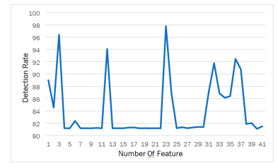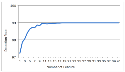 Figure 3 shows the result of ANN detection in KDD dataset in each features. The column show detection rate in percentage and rows show the number of features in KDD dataset. It can be clearly seen that the amount of KDD dataset features are 41. In the detection rate part, the minimum of detection rate is 81.1 % of detection. On the other hand, the highest detection rate for ANN in KDD dataset is 97.8%. ANN by KDD dataset in the feature number 40 can get the minimum result of detection but by the feature number 23 of KDD dataset can find best result as mention in top. Although ANN can find good result in features number 3 (96.4%), 12 (94.8%), 32 (91.78%) and 36 (92.48%), still not the high as feature number 23 (97.8%). It can clearly be seen that there has been a large increase in the number of detection rate between feature number 23 and 40 (increase 16.7 % of detection).