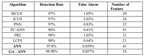 The main problem of the previous methods in the intrusion detection system is that their detection rate is not good enough and the false detection rate is also high. To improve IDS problems, GAANN models have been used in this research to improve the performance of intrusion detection systems by increasing the detection rate and reducing false detection. The results of other research and the results of GA-ANN used in this research are shown in Table 3, which compares GA-ANN and other detection algorithms of other researchers on the KDD database in each feature. The column shows the recognition rate in percentage and the rows show the number of features of the KDD database. Table 4 shows the process of GA-ANN with other researchers’ algorithms in false detection rate on KDD database .