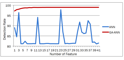 It shows the detection result of GA-ANN on KDD database in each feature. The column shows the recognition rate in percentage and the rows show the number of features of the KDD database. It can be clearly seen that the feature value of the KDD database is 41. On the other hand, the highest detection rate for GA-ANN in the KDD database is 99. Although GA-ANN can achieve good results in feature number 6 (98. It can be clearly seen that there is a large increase in the number of detection rates between feature number 1 and there have been 18 (increase 1. 4 tries to show the performance of GA in ANN result to improve the detection rate of ANN in KDD database. In IDS with ANN classifier algorithm, ANN results are not completely satisfactory because it cannot achieve high rate The detection rate is achieved and needs to be changed. 20 shows the detection rate of ANN with GA optimization. In this study, after installing GA to support ANN, the system can achieve a detection rate of 98.98% in feature number 18. It shows that the system can achieve a recognition rate of 98.98% with only 18 features, so the GA can also minimize the number of features in the machine learning test , GA-ANN can reach a recognition rate of 98 with only 18 features. Figure 3 shows the result of GA-ANN in KDD Database and in figure 6 GA-ANN comparison with ANN in detection rate of KDD database.