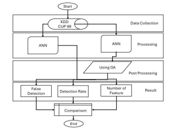 ANN can be used to identify and classify data. However, in order to classify and identify, a large database is required by ANN. To optimize this type of data and overcome the accuracy problem of artificial neural network, this paper proposes the use of Genetic Algorithm (GA). The purpose of this paper is to propose the use of genetic algorithm to improve the ANN mechanism. Genetic algorithm is one of the most popular and widely used algorithms for machine learning. Genetic algorithm is a heuristic and adaptive algorithm for work and search, which is based on evolutionary ideas of natural genetics. In GA, a solution is provided by each of these individuals to the problem. Since GA is a parallel algorithm and is able to find a solution to a problem with multiple subsets, it is considered suitable for IDS. Moreover, GA is able to suggest a solution in a solution with optimal value. Another feature of GA is that it is a suitable method for IDS, especially for detecting attacks based on human behavior. In machine learning, performance is usually evaluated according to the ability to reproduce known knowledge, while the key task is to discover previously unknown knowledge. Evaluated with respect to known knowledge, an uninformed (unsupervised) method easily outperforms supervised methods, and supervised methods cannot be used due to unavailability of training data. Figure 2 shows the flowcharts of GA-ANN.