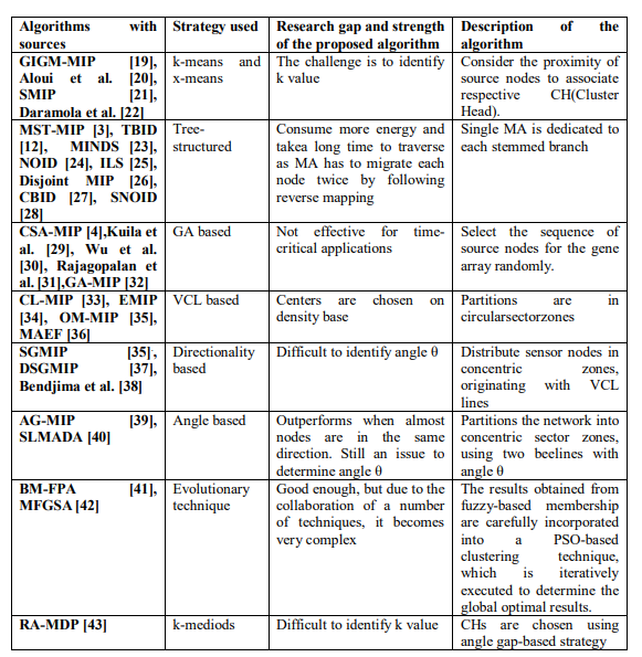 This research investigates the use of the mobile agent paradigm for Wireless Sensor Networks (WSNs) in communicating data. The mobile agent paradigm offers advantages such as efficient resource utilization, reduced network bandwidth usage, improved scalability, and offline stability. However, the effective operation of mobile agents requires careful planning of their migration path to avoid energy consumption and delays. Path determination can be achieved through static or dynamic itinerary planning. Static planning is suitable for known node sequences in physical data monitoring, while dynamic planning is used for target tracking with mobile and evolving targets. Table 1 presents a summary of the literature reviewed in this study, outlining the main findings and methodologies explored.