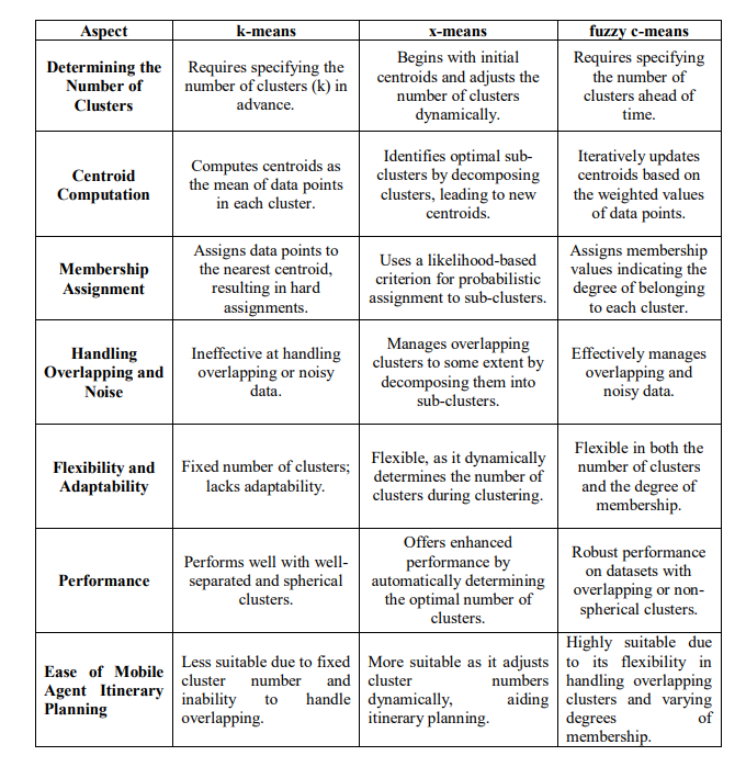 Table 3 gives a comprehensive comparison that includes all aspects for k-means, x-Means, Fuzzy c-Means (FCM), and Adaptive Fuzzy c-Means (AFCM)